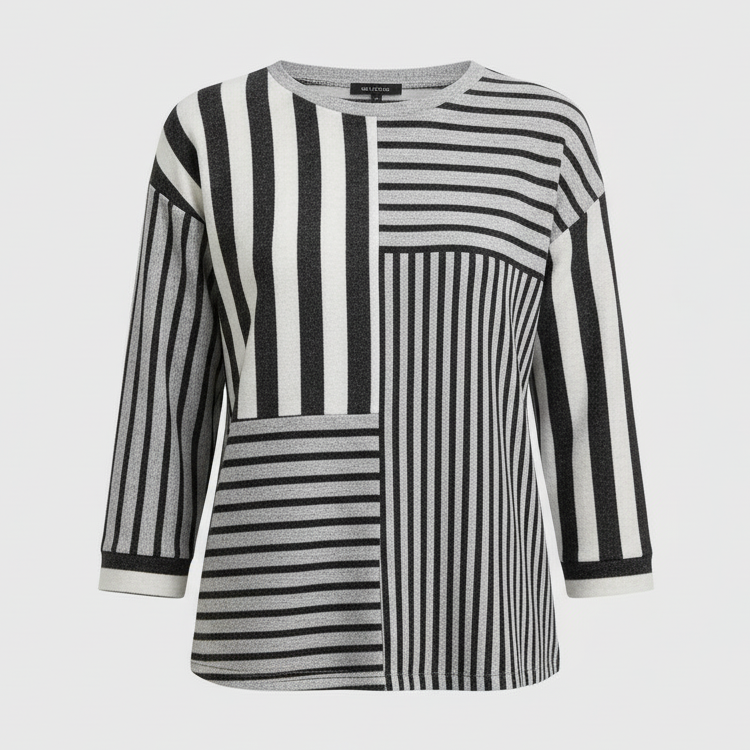 De Den Graaf® blouse combineert een tijdloos streeppatroon met een moderne patchworkstijl, waardoor het een echte blikvanger is. Het contrasterende lijnenspel in zwart-wit geeft de blouse een grafisch effect, terwijl de ronde hals en afgeronde zoom zorgen voor een flatterende pasvorm.
