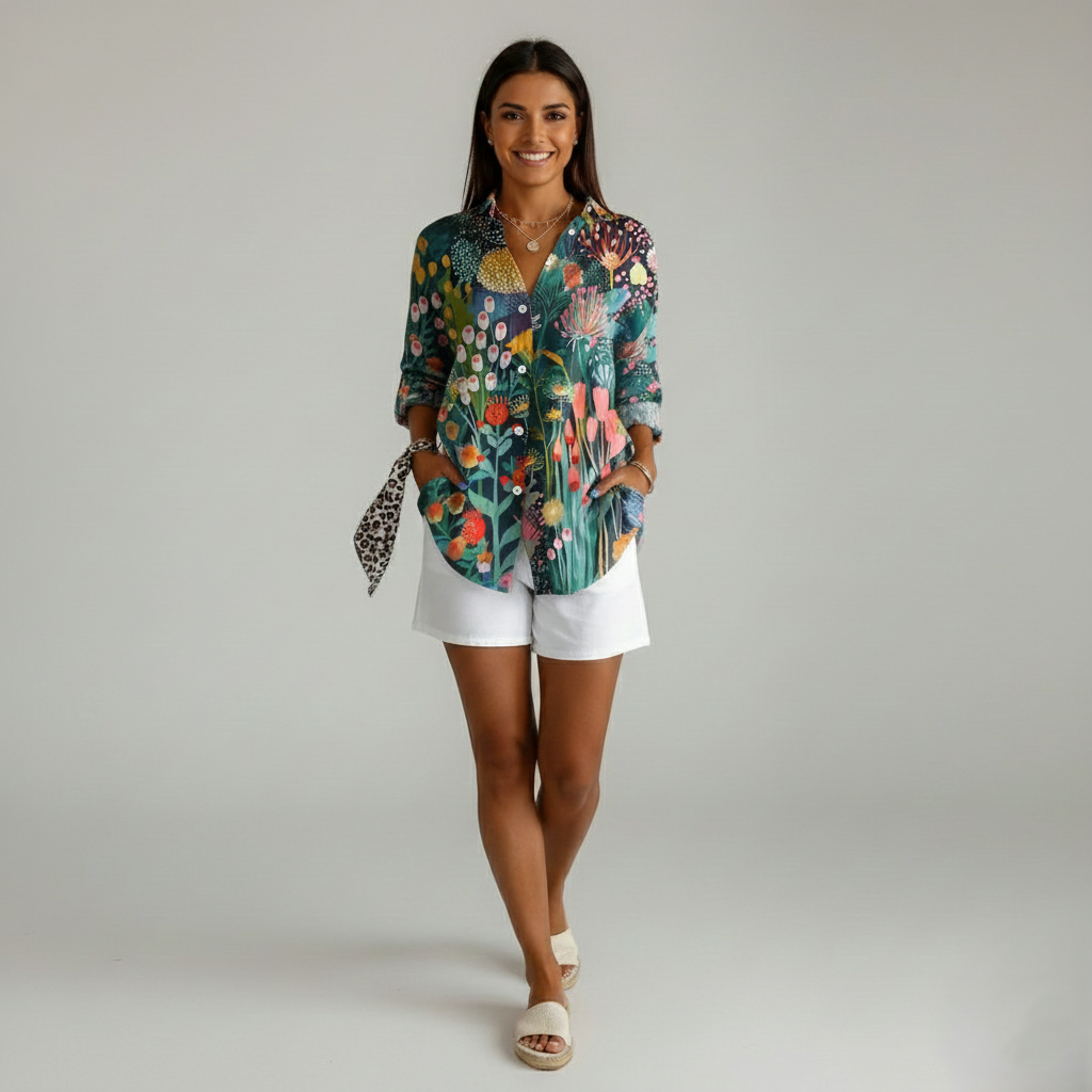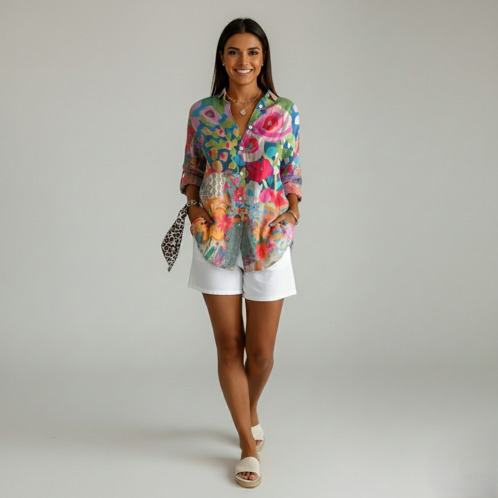 De Den Graaf®-blouse is een echte blikvanger! Met zijn kleurrijke en artistieke print geeft deze blouse je garderobe een speelse en unieke uitstraling. De comfortabele pasvorm en het luchtige materiaal maken hem ideaal voor zowel casual als chique gelegenheden.