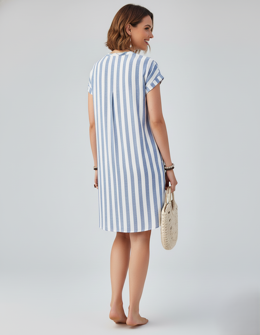 De stijlvolle jurk combineert verfijning met dagelijks comfort. Met haar subtiele strepen en flatterende V-hals straalt deze jurk klasse uit zonder moeite. Of je nu onderweg bent naar een brunch, een dag op kantoor of een avondwandeling in de stad, Martine™ is jouw go-to keuze voor elke gelegenheid.