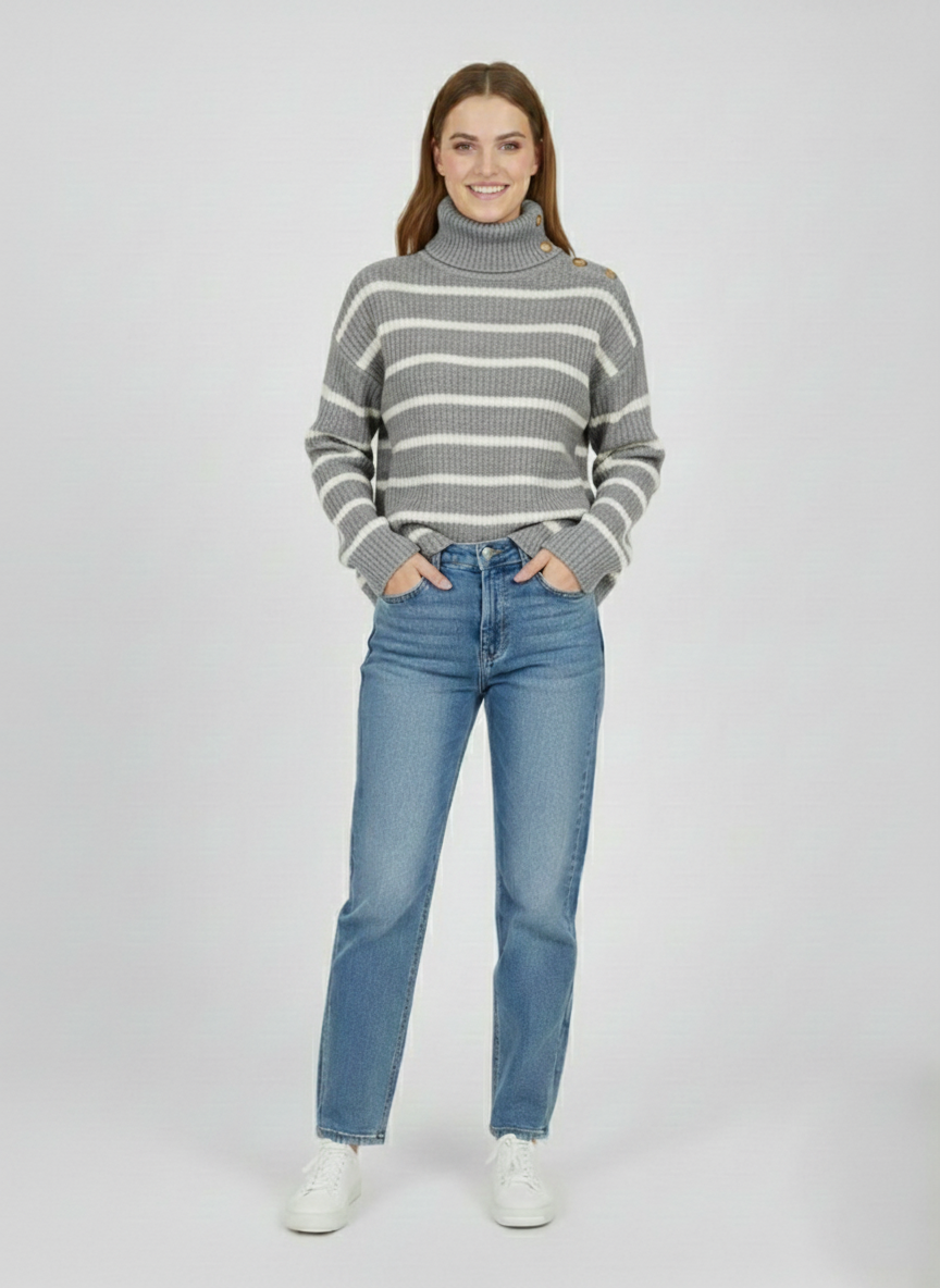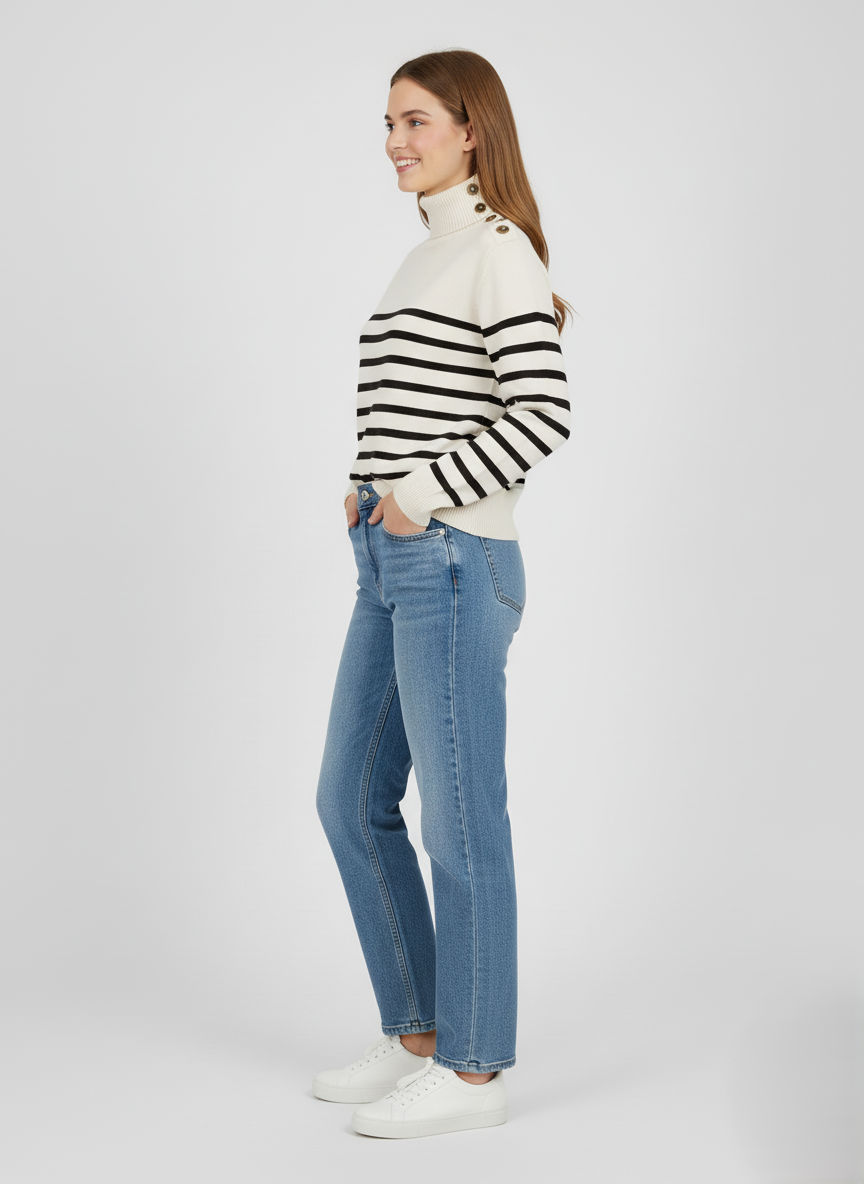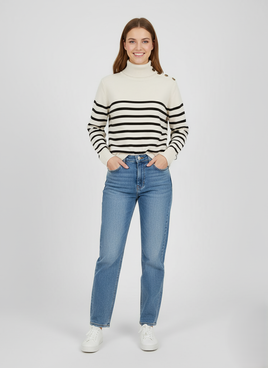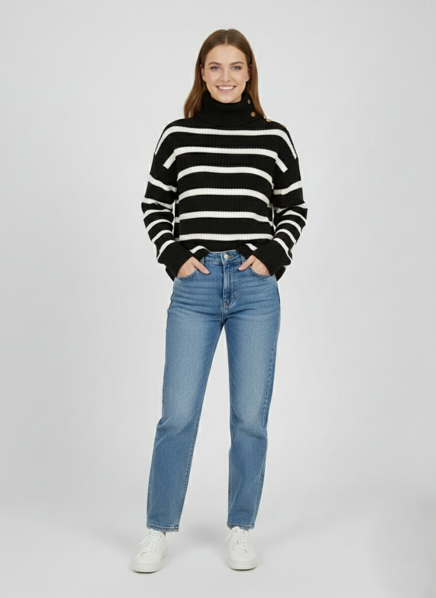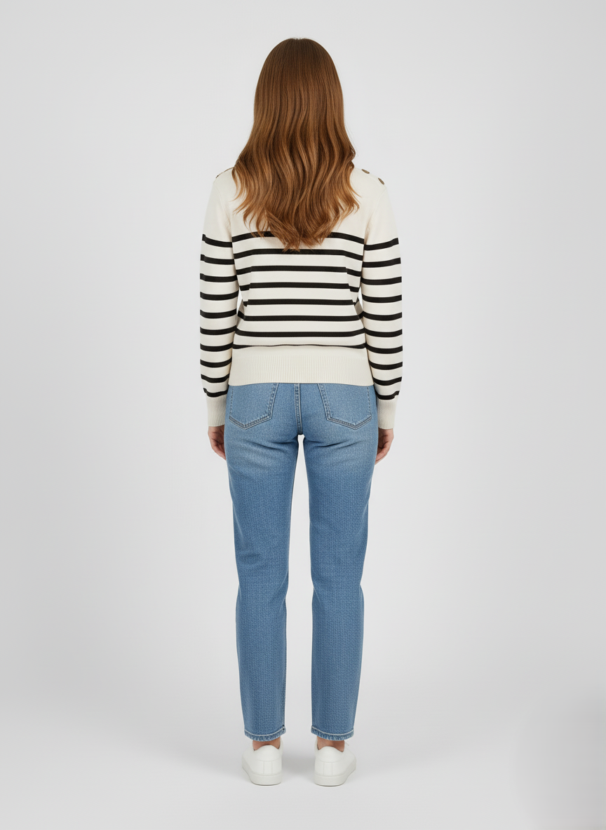 Tijdloos en veelzijdig: De gestreepte print maakt deze trui een echte klassieker die je eindeloos kunt combineren met jeans, rokken, of zelfs over een jurk. Het is de trui die je letterlijk overal mee kunt dragen.