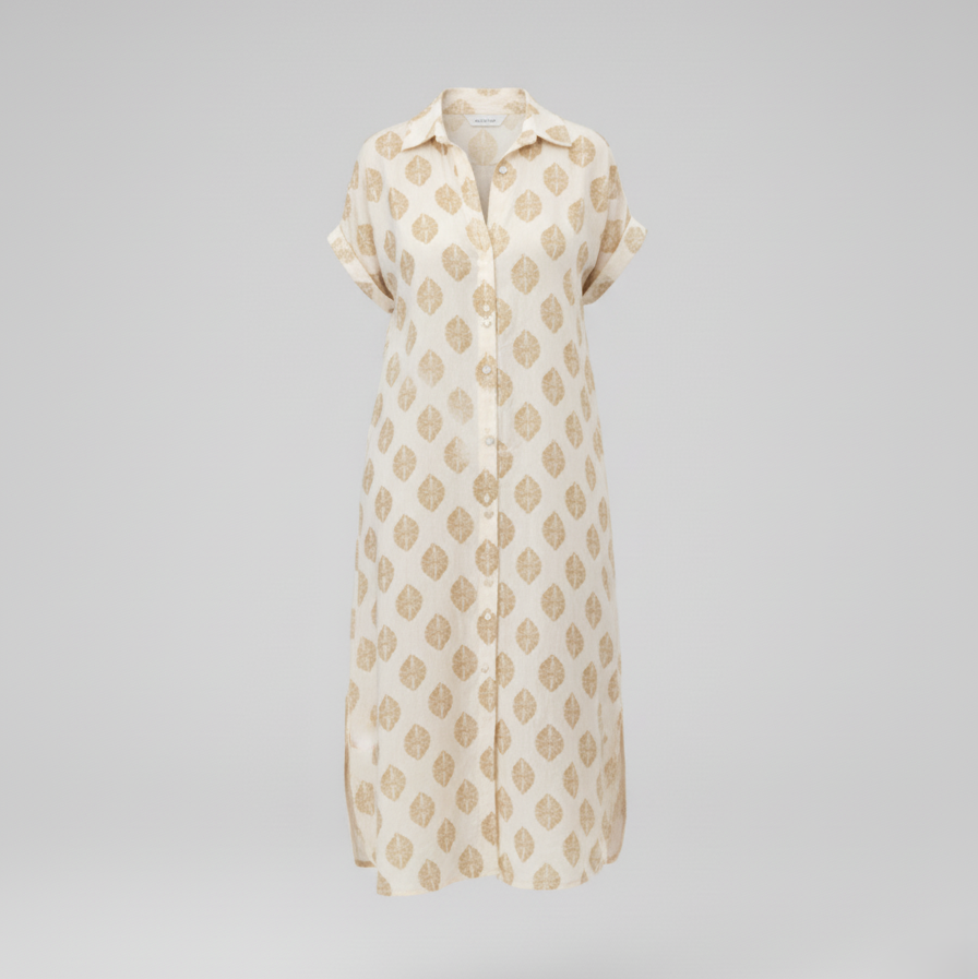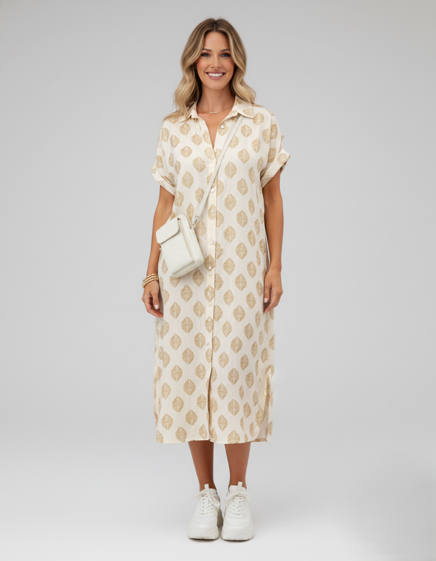 Stap stijlvol de lente in met deze Lente Jurk. Het modieuze printdesign, de elegante reverskraag en de veelzijdige korte mouwen maken deze jurk een must-have voor je voorjaarsgarderobe. Dankzij de losse pasvorm en luchtige stof blijf je de hele dag fris en comfortabel, terwijl de subtiele zijsplit zorgt voor een vleugje elegantie en bewegingsvrijheid.