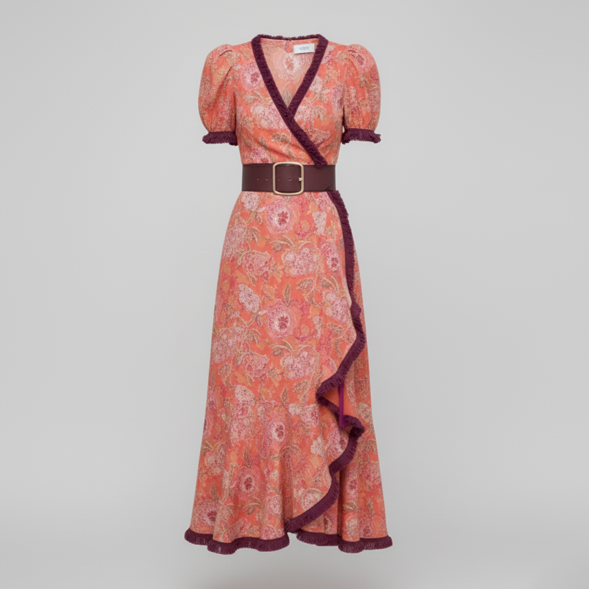Deze jurk is gemaakt in een delicate roze tint en heeft korte mouwen en een vloeiende maxi lengte die zachtheid en elegantie uitstraalt. De lichtgewicht stof zorgt voor beweging en ademend vermogen, zodat je de hele dag comfortabel en zelfverzekerd blijft.