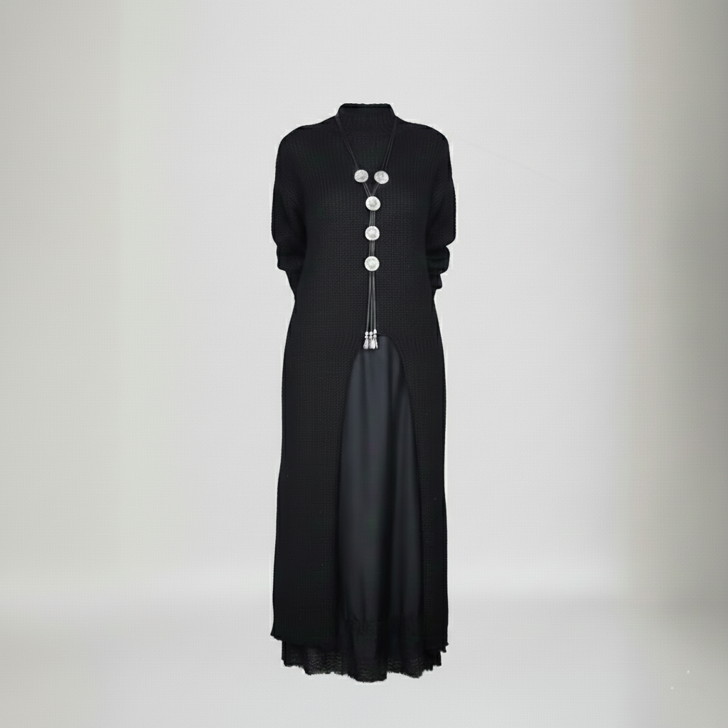 Combinatie van twee stukken: Lange gebreide trui met een vloeiende jurk eronder – direct klaar om te dragen.