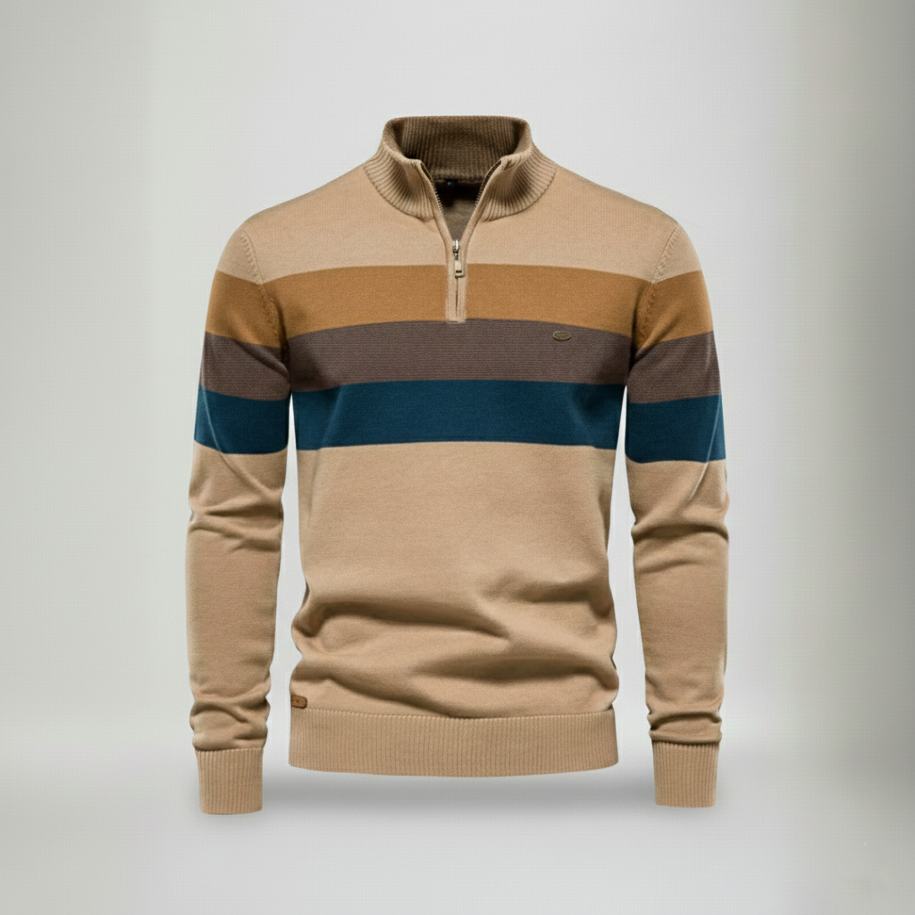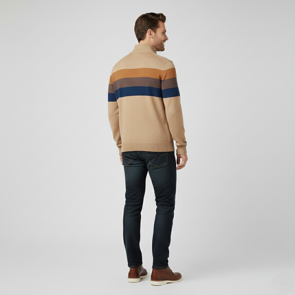 De  Retro Sweater voor heren met opstaande kraag en ritssluiting biedt niet alleen warmte en comfort, maar past ook perfect in de huidige retrotrend. De opvallende strepen geven je look een speelse touch, terwijl het moderne ontwerp ervoor zorgt dat je er altijd trendy uitziet.