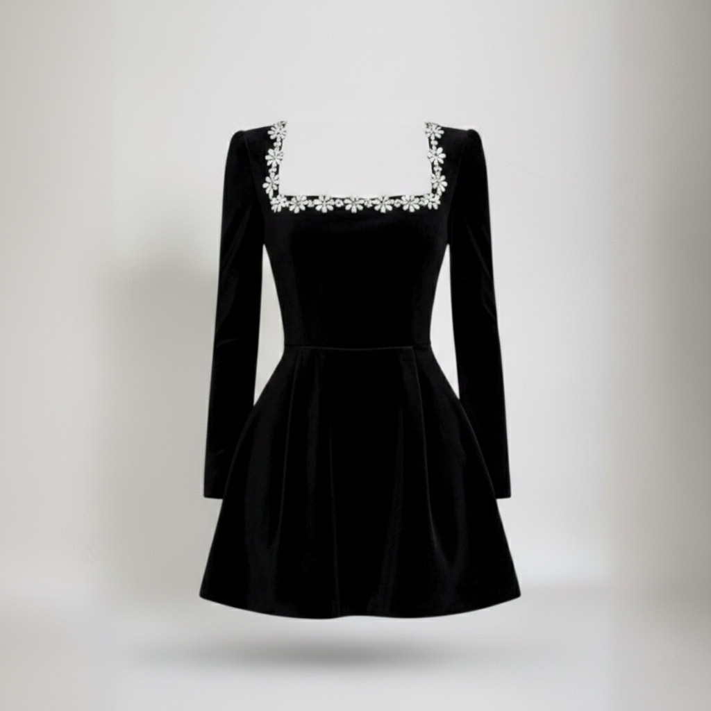Betreed pure verfijning met een jurk die elke feestelijke gelegenheid onvergetelijk maakt. De combinatie van edel fluweel en fonkelende kristaldetails belichaamt feestelijke glamour en tijdloze elegantie.