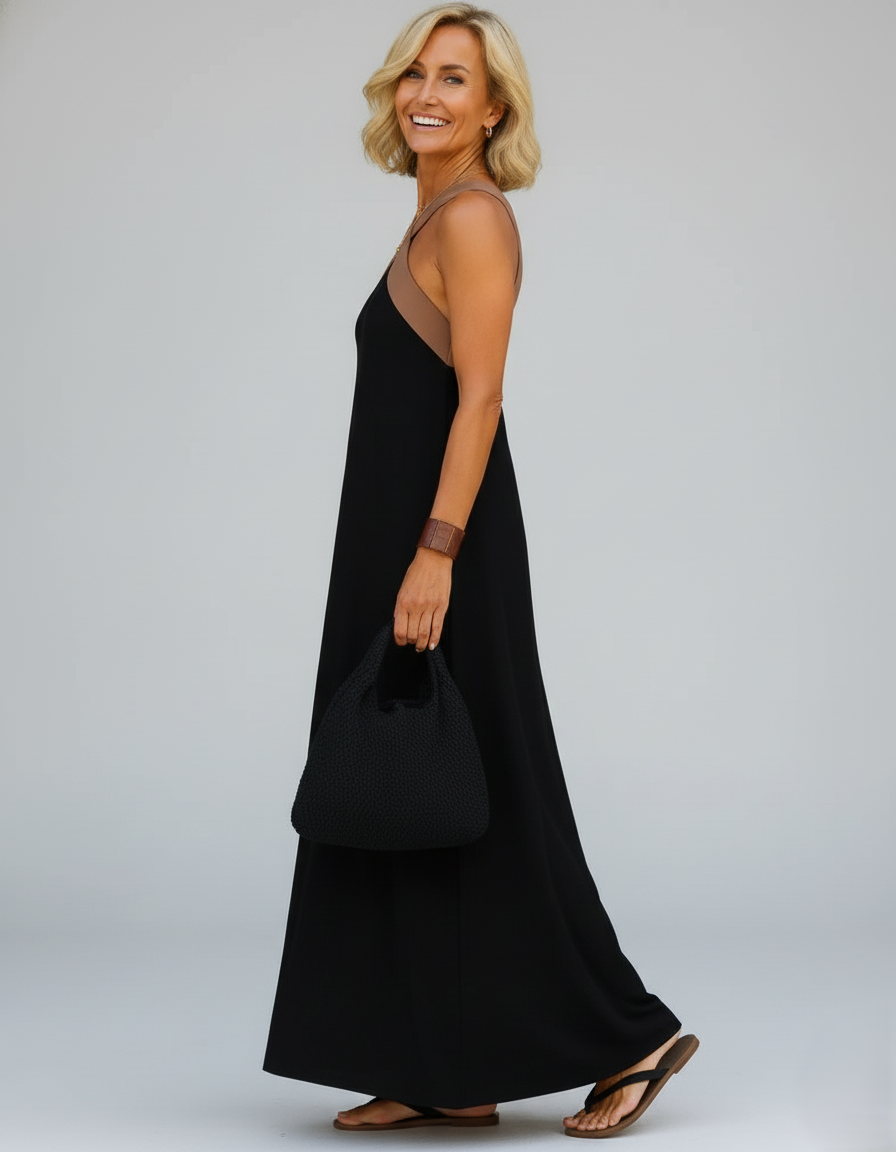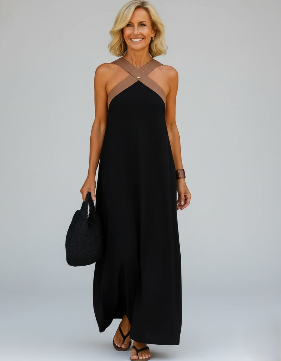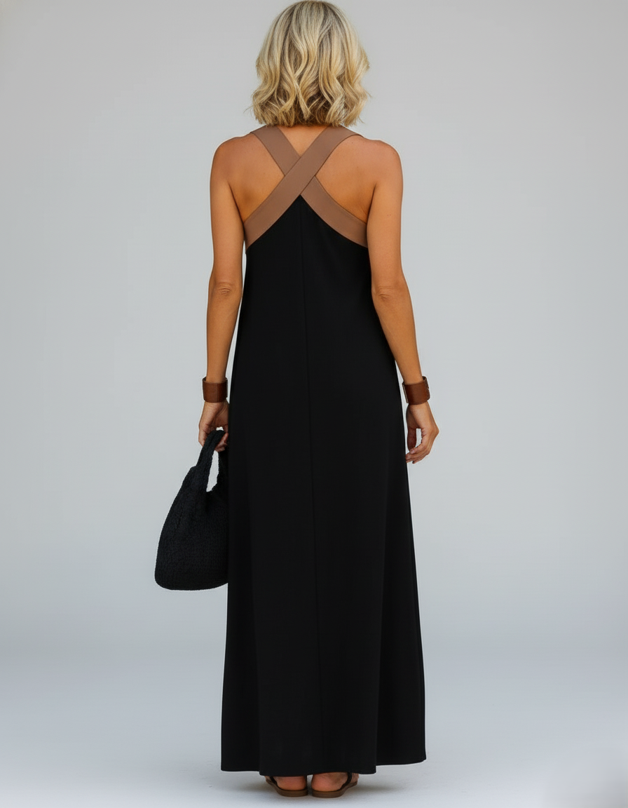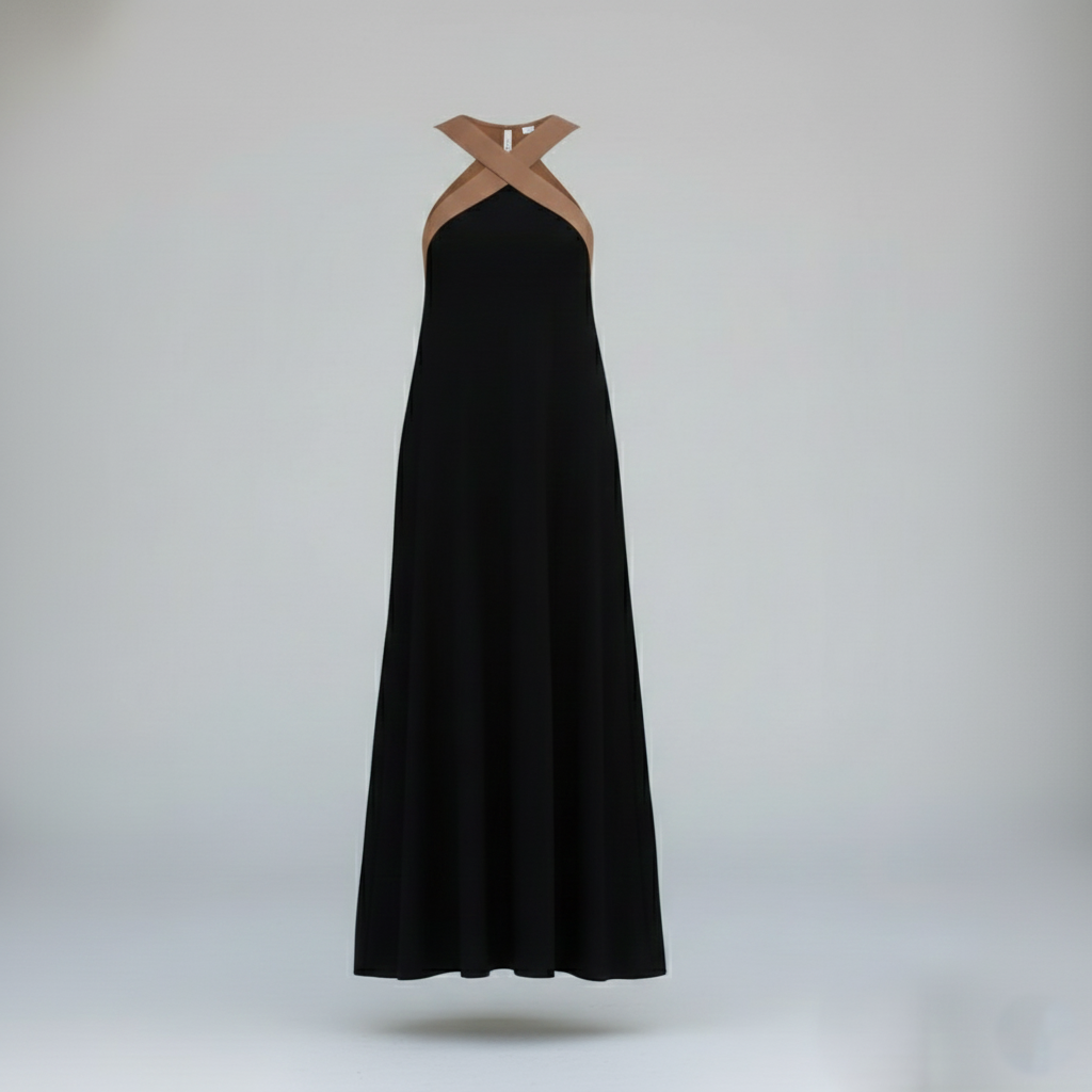 De gekruiste halslijn verbetert het silhouet, terwijl de open rug een sensuele, verfijnde touch toevoegt.