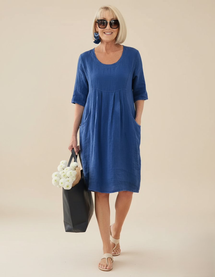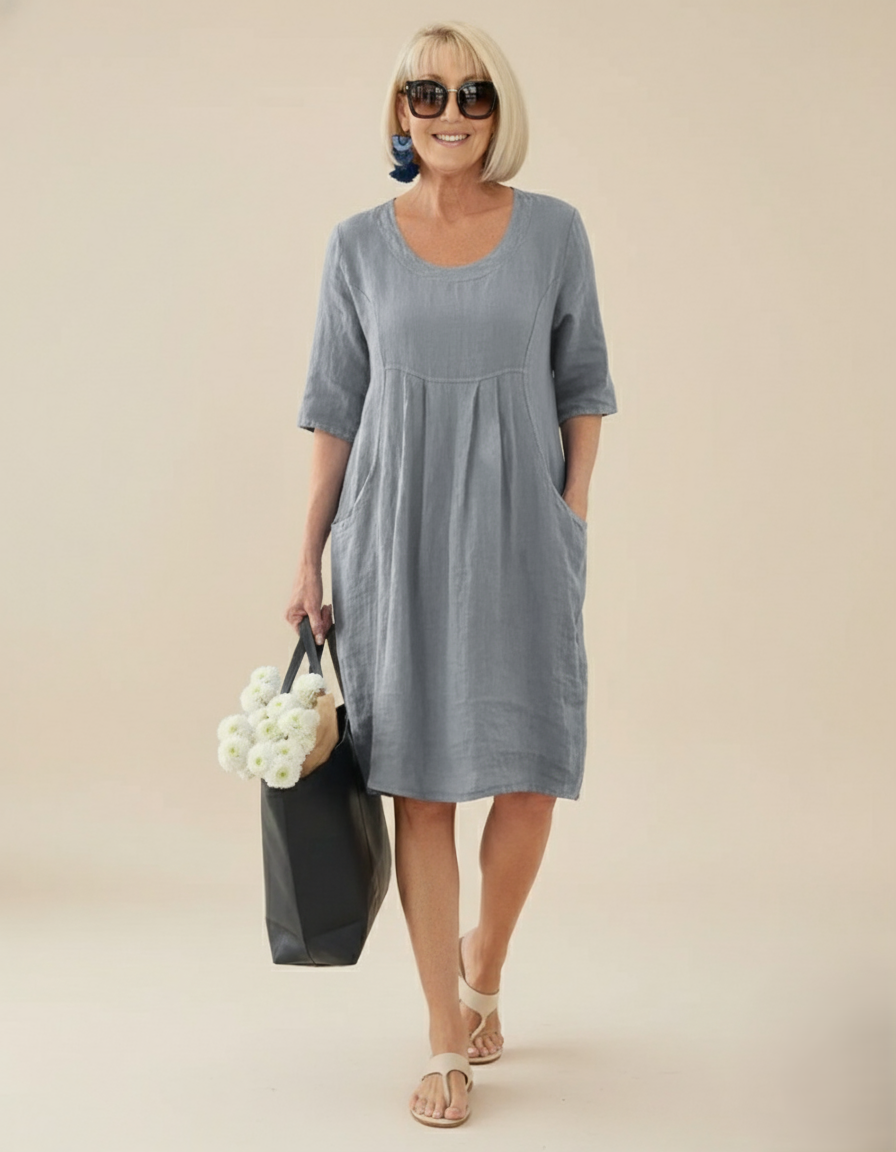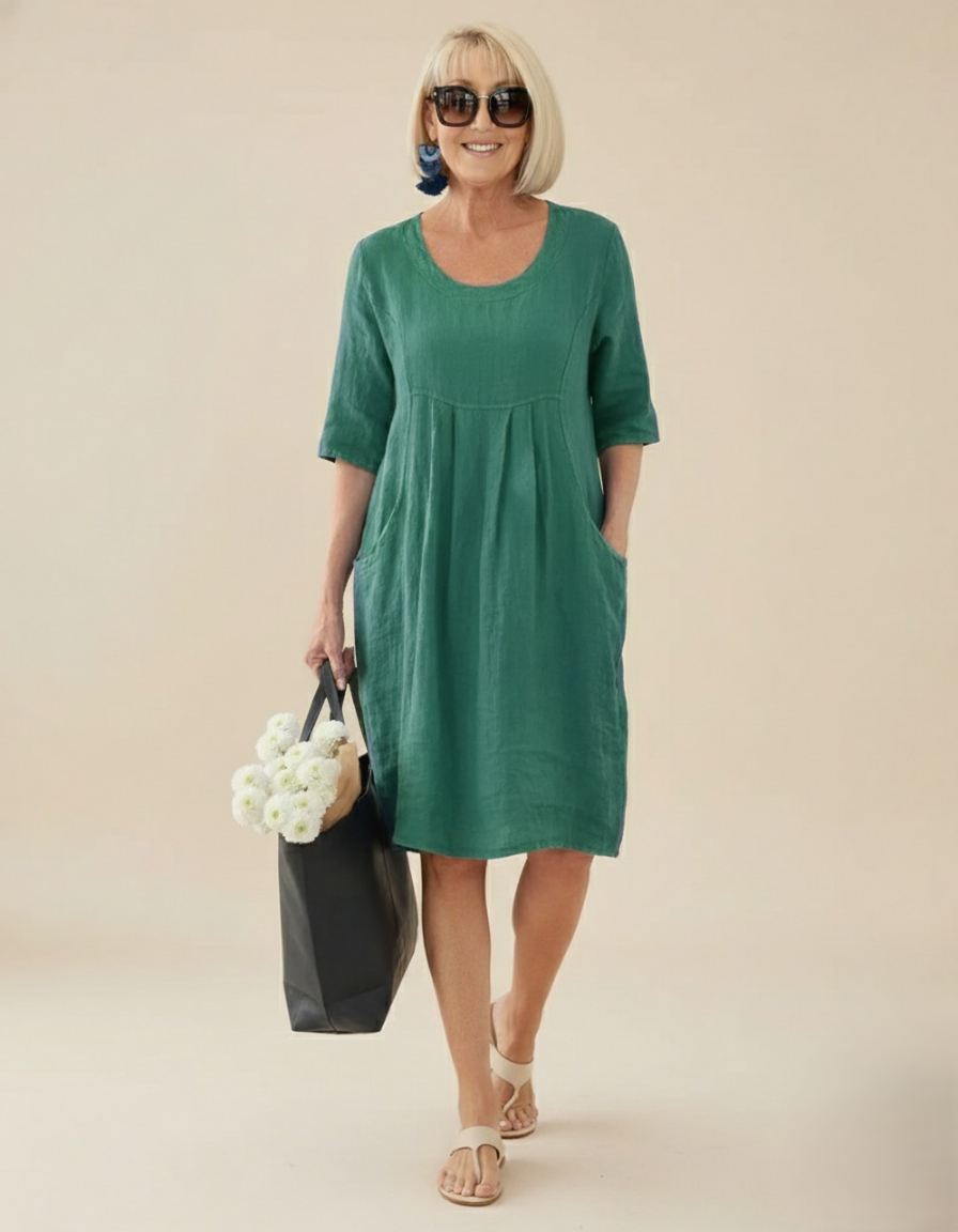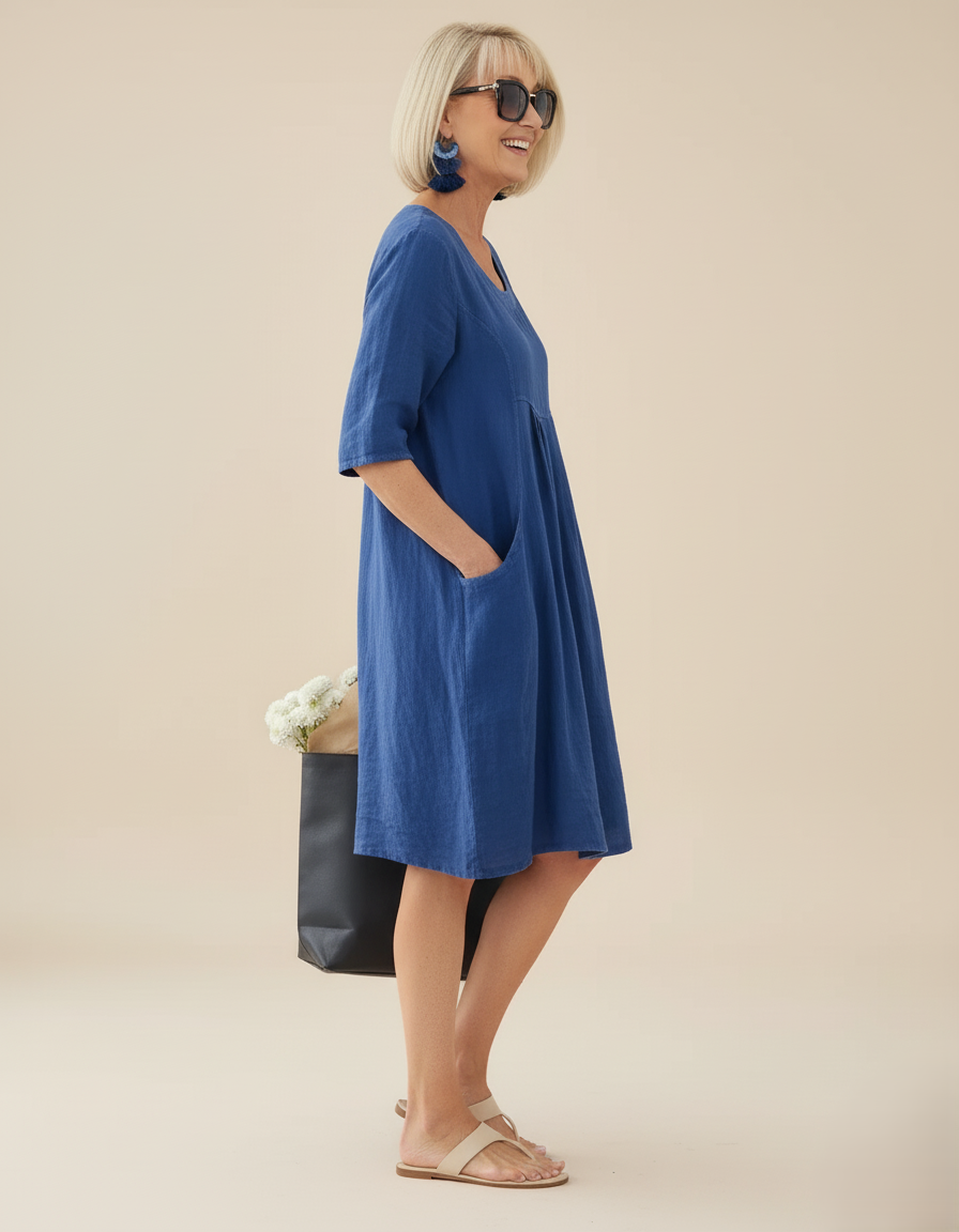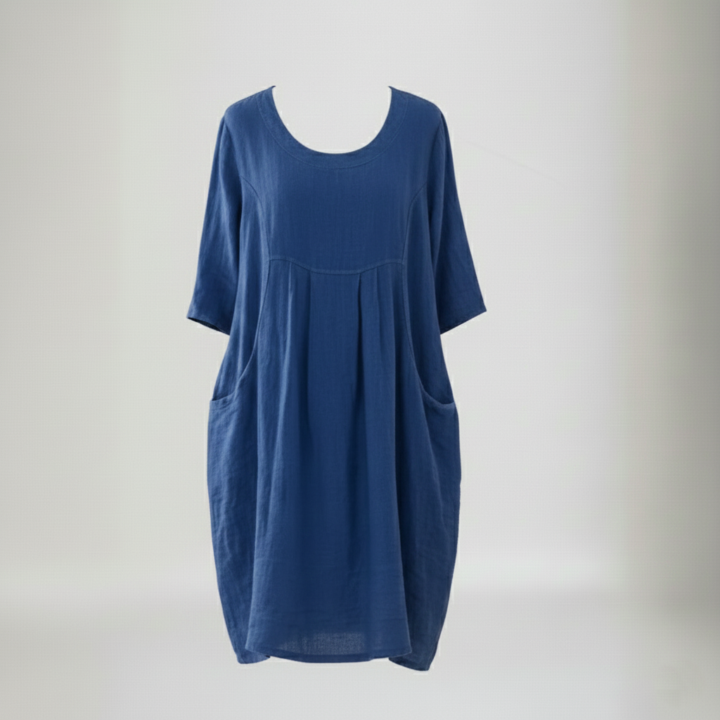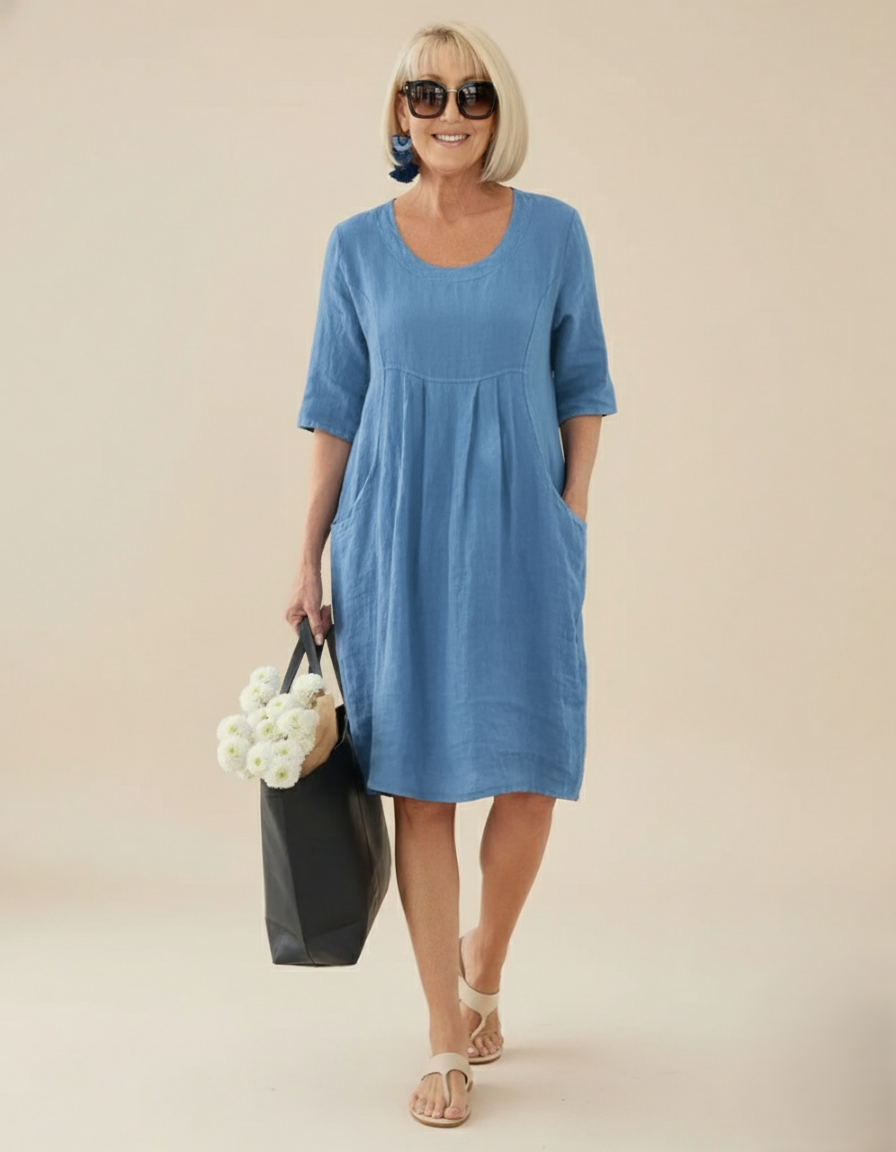 Onze effen midi-jurk met zakken is de belichaming van casual stijl en comfort, het ontwerp in een effen kleur maakt het gemakkelijk om te stylen, waardoor het geschikt is voor verschillende gelegenheden en aanpasbaar aan jouw persoonlijke stijl.