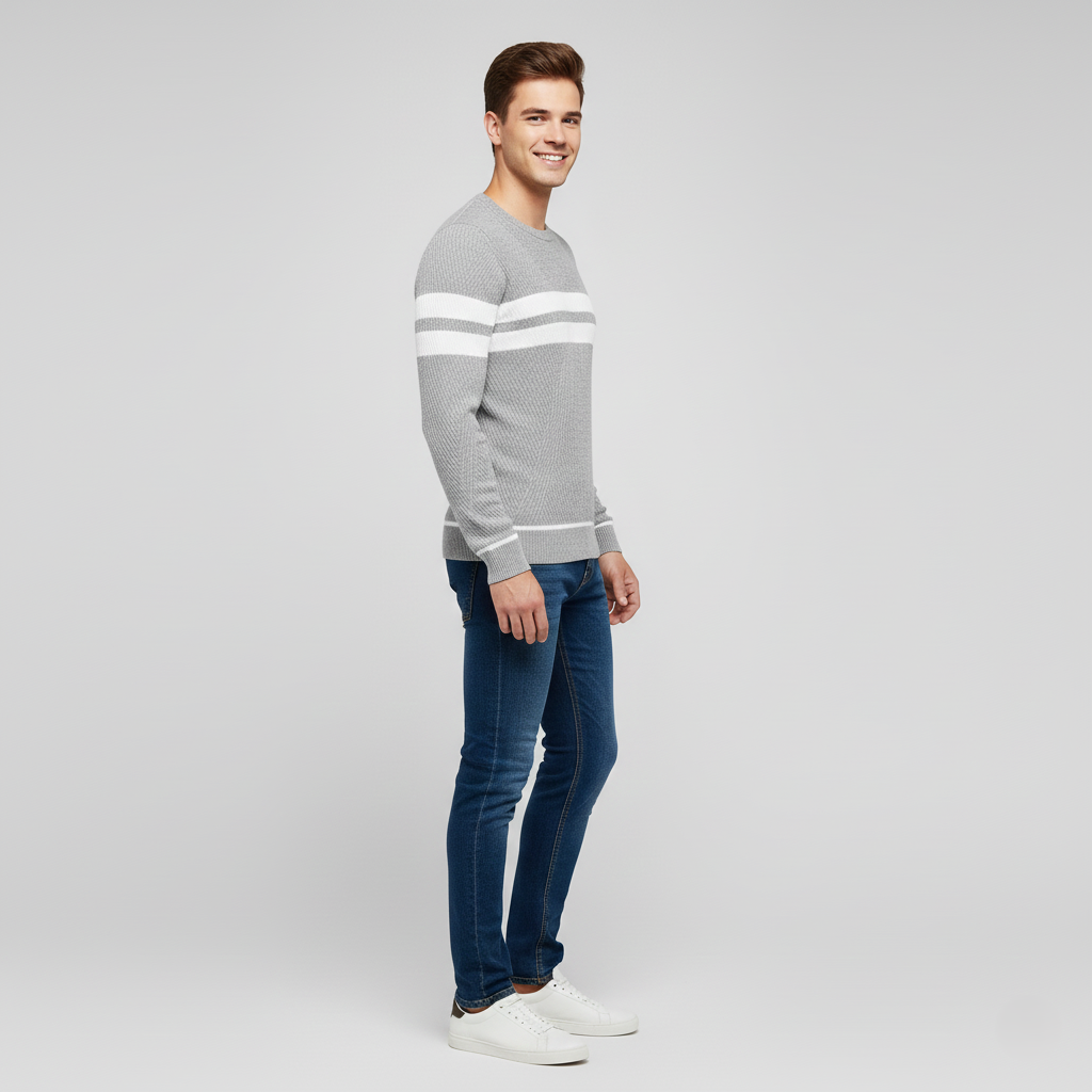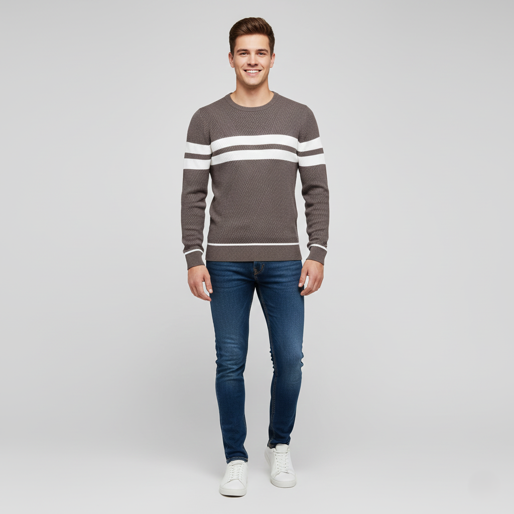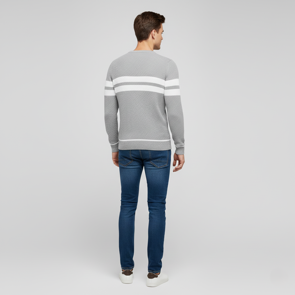 Geef je garderobe een stijlvolle upgrade met de herentrui met strepen. Gemaakt van premium katoen en ontworpen voor een slank en modern silhouet, biedt deze trui het perfecte evenwicht tussen comfort en verfijning. De subtiele strepen zorgen voor een tijdloze uitstraling die zowel casual als gekleed gedragen kan worden.